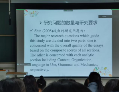 彭老师以若干学术论文为例,结合英语专业发展特点,围绕论文的选题、文献综述、研究问题的类型及要求,以及文献检索、文献评析等方面进行了详细的讲解。