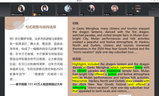 3月13日,翻译系举办武汉广播电视台海外频道HanNews电视新闻编译实习第五期案例分享会,参与本期实习的2023级翻译硕士(MTI)及2021级、2022级翻译专业本科学生就编译及配音任务进行复盘总结。会议在逸夫人文楼A5002举行,翻译系主任步婧老师主持会议。