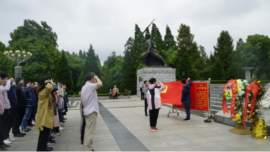 在黄麻起义和鄂豫皖苏区革命烈士陵园,学院党员集体在革命烈士纪念碑广场列队肃立,向革命烈士纪念碑敬献花篮,鞠躬致敬革命英烈。在巍然耸立的纪念碑下,全体党员面向党旗,举起右手,重温入党誓词,坚守入党初心。