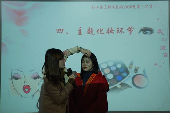 比赛一开始,参赛选手就都拿出了各自的看家本领,现场气氛非常活跃。选手们分别从夜店、万圣节和新娘三个主题为她们的同伴上妆。其中,17级日语专业李蓦然同学将她的同伴打扮成了一个可爱的鬼怪,给万圣节妆容带来了一个新思路。李佳同学采用大红色配合俏皮双马尾,有一丝阴森恐怖但又不失可爱。马翠同学主要用棕色和玫红色塑造了一个娴静端庄的新娘角色。黄卜媛同学在眼部采用珠光色金色和紫色,独具一格,配合俏皮的小辫子,更是让人眼前一亮