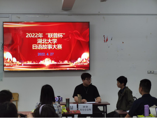 4月27日下午2:30,bv1946伟德日语系在逸夫人文楼A3002举行了2022年“联普杯”日语故事大赛。本次大赛由日语系的梁青、刘海燕、张静、黄凤琴、吕端、姜红、王辉、刘霞、唐芙蓉、张晶鑫十名老师及研究生李格、刘敏、胡卓颖共同担任评委。