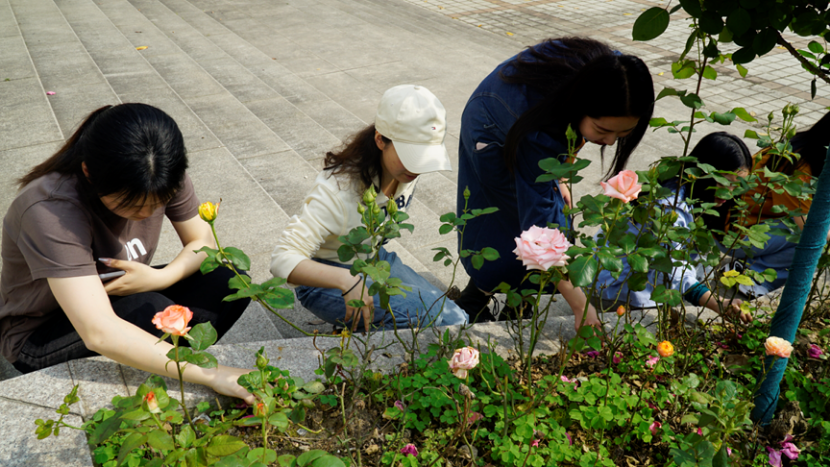 最后,黎老师和同学们一起来到逸夫人文楼广场的户外“芯宠空间”为玫瑰松土、去除杂草,同学们共同在精心养护花朵的劳动实践中体会生命的价值和自然的美好。
