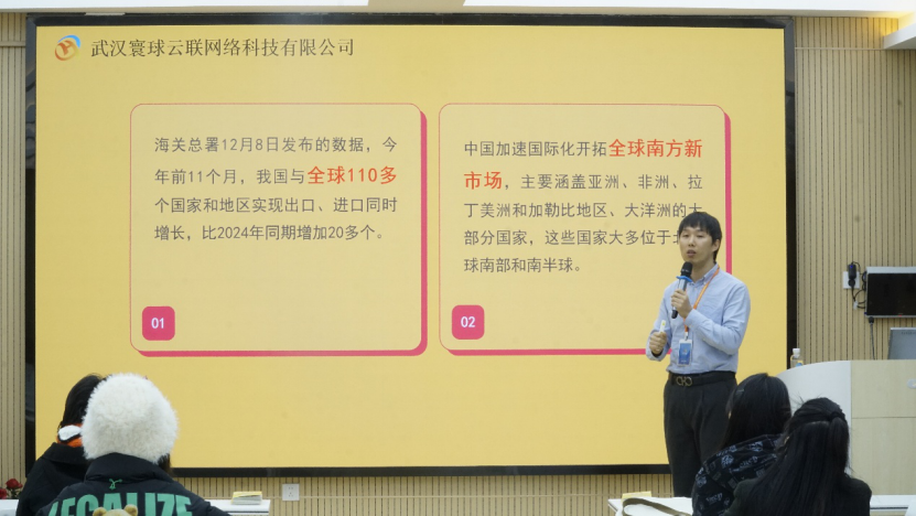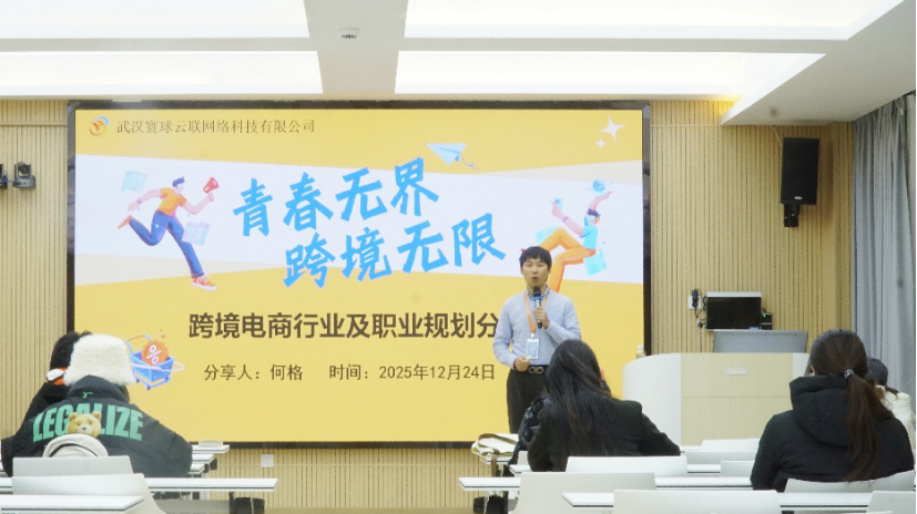 为助力外语类学子精准把握行业动态,明晰跨境电商领域职业发展方向,搭建理论与实践衔接桥梁,12月24日,bv1946伟德国际特邀武汉寰球云联网络科技有限公司在院内开展跨境电商行业分享交流会。英语系教师陈培、辅导员王立及英语、翻译专业50余名本科生参与活动。