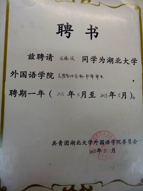 除此之外,龙晓凤还积极参加志愿服务活动,因为人生的价值不仅在于实现自我价值,更在于对社会的价值贡献,所以龙晓凤加入了bv1946伟德志愿者协会,参加了诸如“善行100”之类的志愿服务活动。“我喜欢志愿活动,所以我愿意花时间去做”龙晓凤真诚的说道。
