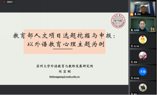 11月23日,苏州大学刘宏刚教授应学院邀请,以“外语教育心理”主题为例,为学院教师作“教育部人文项目选题挖掘与申报”专题学术讲座。讲座采用线上的方式进行,由学院副院长吕奇教授主持,60余位教师参加讲座。
