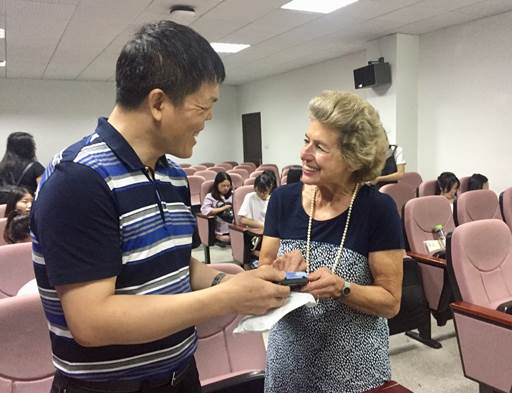 最后Liese Katschinka教授提供了一个LTI的信息网站,供有兴趣的师生了解更多的相关知识:www.eulita.eu。现场的提问环节,老师和同学们都积极与Liese Katschinka教授交流互动。其中安鲜红老师问道:“成为一名优秀译员有没有什么秘诀?”教授说译员的路上没有捷径,只有——“work”,“learn” and “practice”。来自Liese Katschinka教授的权威回答,更加坚定了同学们朝着翻译方向不懈努力的决心。整场讲座气氛融洽,Liese Katschinka教授的精彩演讲获得了全场听众的阵阵掌声。