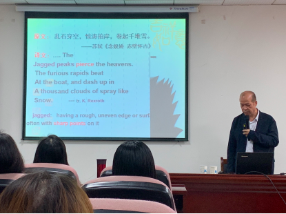 首先,张教授从他的选题背景,为我们讲述了诗歌/文学与绘画的关系,他指出,不同门类艺术之间的界面研究,实际上是不同门类艺术之间相互借鉴、吸收、融合与发展的研究。接着,张教授详细介绍了绘画语言要素的功能与价值以及绘画要素在翻译中的应用,通过绘画的视角,以一段段经典诗句与一幅幅绘画引导听众重新审视与赏析译文,另辟蹊径。最后,张教授为我们分析了绘画对于文学翻译的价值与意义,他认为,通过揭示翻译的绘画艺术认知机制,可以构建区别于语言学、文学视角翻译研究范式的绘画美学视角翻译研究范式,为翻译学领域增添新的研究内容与方法,拓展翻译学跨学科的疆域。