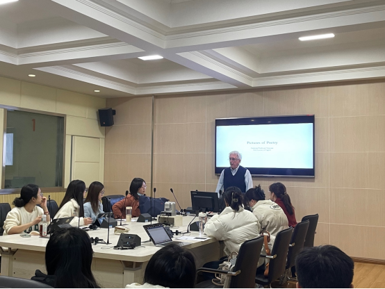Richard Young教授通过自己的亲身经历,以诗歌与图片相结合的方式,带领学生们深入感受他创作的16首诗歌,这些诗歌描绘了他在不同人生阶段的心境和体验。在讲解过程中,Richard Young教授通过视听结合的形式展现了不同诗歌的音韵和形态特征,每一阶段的诗歌都具有丰富而有趣的创作风格和主题。在讲座中,他尤其强调了唤醒记忆、阅读诗歌、建立联结、讨论感受以及进行自我创作并分享的重要性。