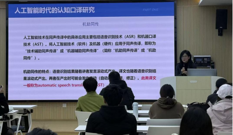 12月10日,广东外语外贸大学苏雯超教授应学院邀请,为学院师生作题为“人工智能时代的认知口译研究”的学术讲座。本次讲座在逸夫人文楼A3014举行,由翻译与跨文化传播研究所所长韩晓龙博士主持。