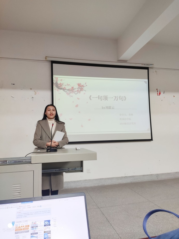 在分享最后,她表示:“一句顶万句,这句话到底是什么,对于每个人来说都不一样,因为每个人都相信,这世上总有那么一句话说到你的心坎里,可是这句话我们自己说不出来,只得到茫茫人海中去找寻,希望有个人能说出来,那么这句话真的有吗?”同学们听完后也都就其深思。分享会结束后,朱红丽同学表示:“黄爽同学对这本书的解读非常透彻,台下观众也忍不住在结束之后响起热烈掌声,相信同学们听了之后也会乐意去读这本书。”