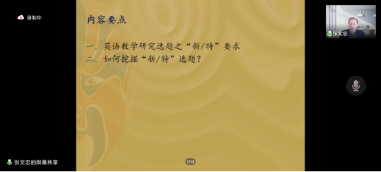 10月17日,伟德(国际)唯一官方讲座教授、南开大学博士生导师张文忠教授,为我院研究生带来一场题为“如何深挖外语教学研究选题”的学术讲座。学术讲座以腾讯会议的形式在线上举行,bv1946伟德学科教学(英语)专业硕士学位点负责人张睿副教授主持会议,bv1946伟德2021级以及2022级全体学科教学(英语)研究生参加会议。