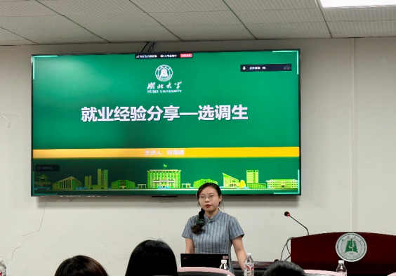 经验分享环节汇聚不同学科求职多元视角。叶雨晴(学科教学)、王迎楠(学科教学)、魏袁(英语笔译)、薛子悦(英语口译)、王梦俐(日语笔译)、杨婷婷与袁雪梅(外国语言文学)共七位2025届毕业生倾囊相授。他们结合自身斩获教师编制及优质岗位的经历,聚焦选调生、教师编备考策略、企业面试技巧与职业选择考量、申博经验等,以鲜活案例为学弟学妹提供了可复制的成功范式。
