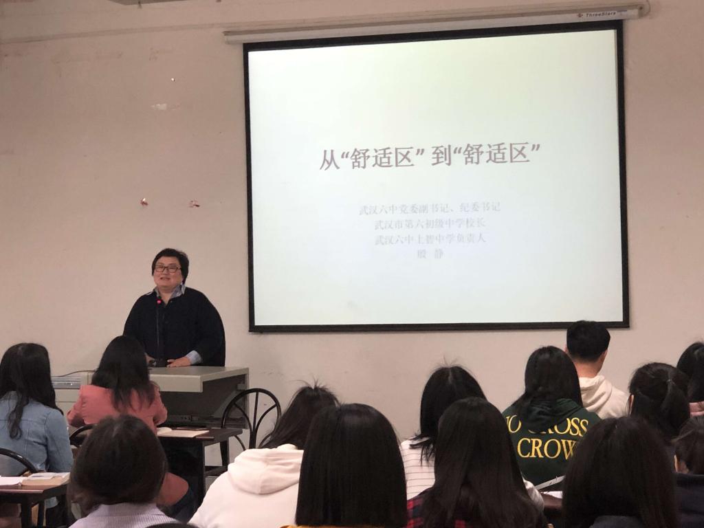 4月12日下午2点,武汉六中党委副书记、纪委书记、武汉市第六初级中学校长兼武汉六中上智中学负责人殷静应邀深入学院王家芝教授主干课堂,为18级学科英语教硕班同学开展中学教育教学智慧管理专题讲座。讲座正式开始前,学校招就处李莉处长、谌瑾副处长、学院林二友书记、占婧副书记热情接待殷书记,深入交流实习招聘、教师交流等事宜,推进学院与武汉六中共建合作事宜。